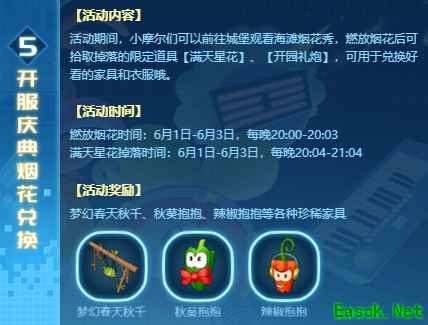 活动期间,小摩尔们可以前往城堡观看海滩烟花秀,燃放烟花后可拾取掉落的限定道具【满天星花】、【开园礼炮】,可用于兑换好看的家具和衣服哦。