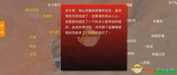 刘大哥,我从风凰姐那里听过你,虽然我的任务完成了,但是请你务必小心,这里曾经诞生了一个叫女心医师会的组织,此地非常凶险,另外那个金属棒被我封存起来了,你别再碰它了.