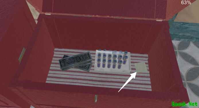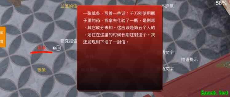 一张纸条,位置如图,内容:千万别使用瓶子里的药,我拿去化验了一瓶,是剧毒,其它成分未知。这应该是第五个人的,她住在这里的时候长期注射这个。我还发现树下埋了一封信.