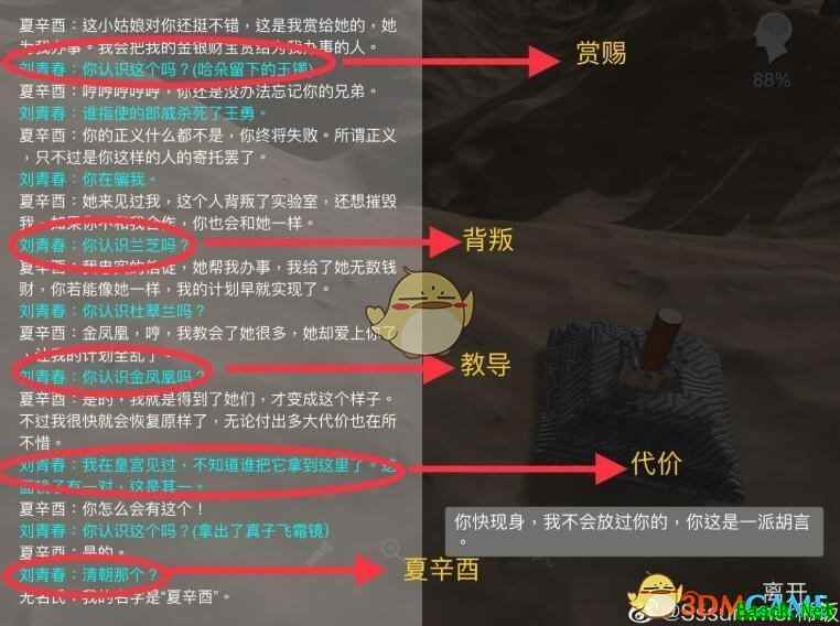 背叛:根据“见到那个人”提示,转动银制摆件向左,巨像附近出现一个石台插座,在白天风起的时候点击将金属棒放进去,即可与夏辛酉对话(可重复多次),选择不一样的回答获得不一样的线索,具体见图: