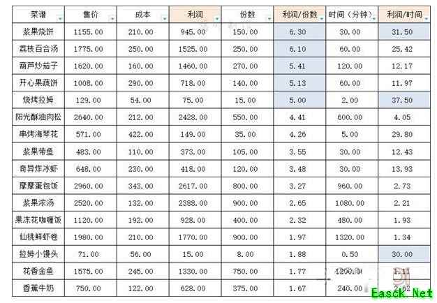 利润/时间:制作该菜品用于出售获得的每分钟利润(实际上是没用的)