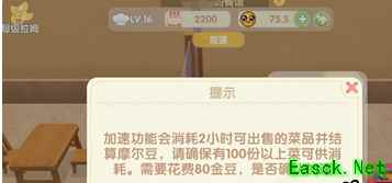 方法:如图,餐厅页面上方,有加速选项,80金豆加速一次