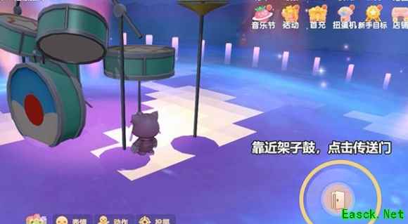演唱会入口在海面上的架子鼓旁,到达九点以后,小摩尔们需要游泳至架子鼓处,演唱会通道标志将会出现,点击便可以进入到现场了。