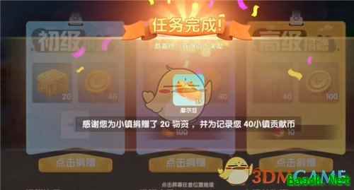 初级捐赠消耗任意一个材料就行,中级捐赠可以用100摩尔豆捐赠,高级捐赠要用到10金豆但是能多拿100小镇贡献币,每名摩尔每日默认都有五次捐赠的机会。
