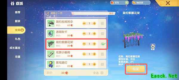 3.上下滑动找到【简约紫藤花架】家具,勾选后点击右侧的【购买】;