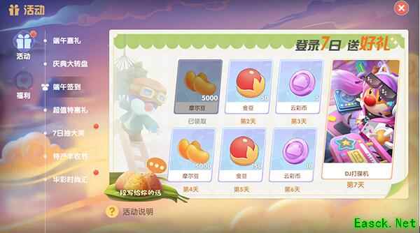 2021年6月11日5:00--6月17日24:00期间,参与七日签到活动,在签到奖励中就包含DJ打碟机(含动作),另外还可以拿到扭蛋币*15、金豆*200、摩尔豆*10000,大家不要断签,最好奖励都能拿到!