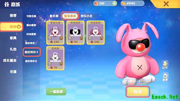 3、切换到【服装】-【超拉特权II】-【图图套装】,点击【一键换装】,购买兔兔套装所有的服装即可。