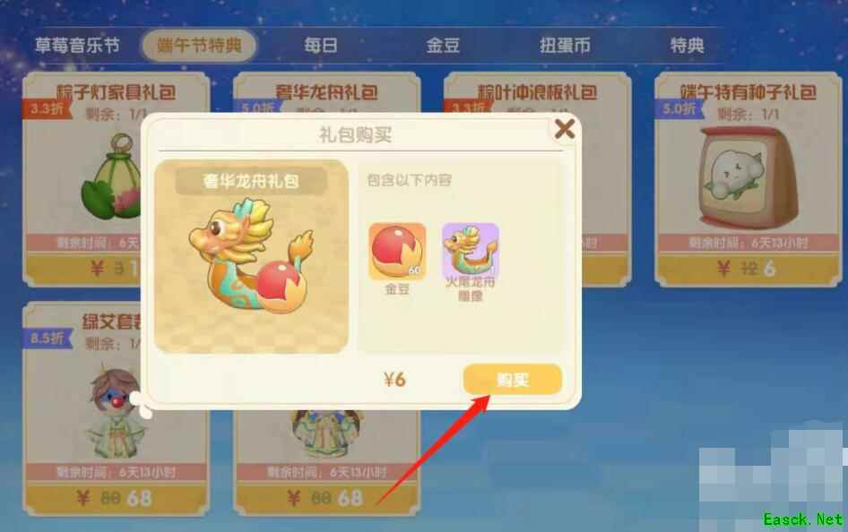4、选择【奢华龙舟】礼包,点击购买即可获取火尾龙舟雕像及60金豆。