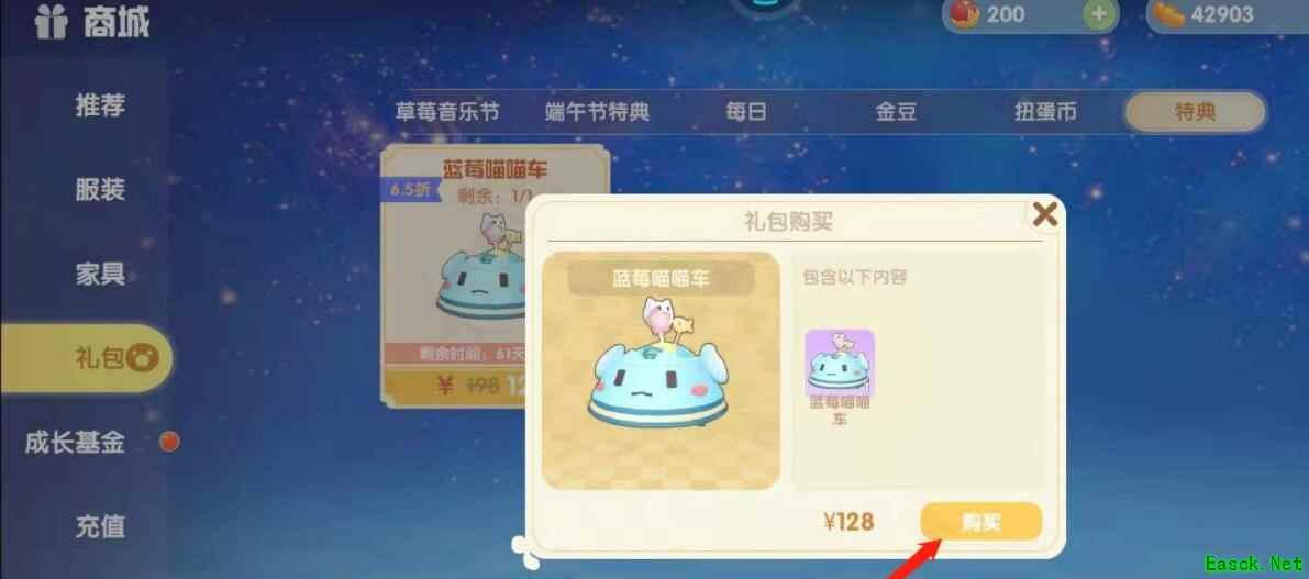 4、点击蓝莓喵喵车礼包,点击购买即可。