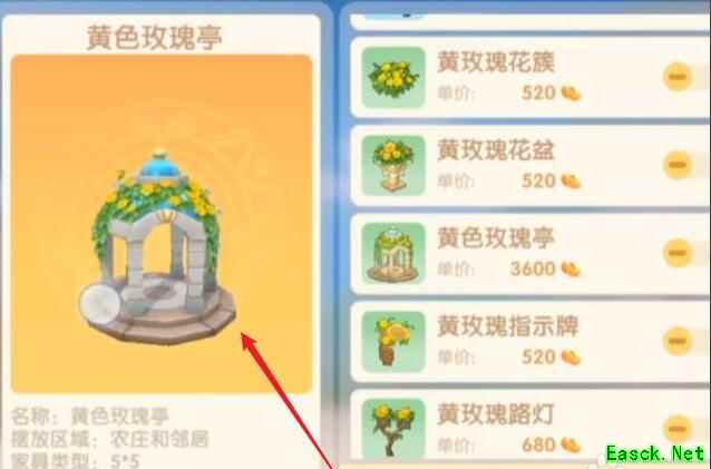 4、最后就能在列表中看见黄色玫瑰亭了,占地5*5,属于户外建筑。