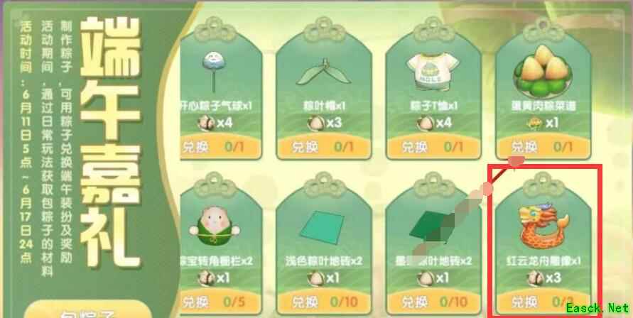 在6月11-17日端午节期间,大家可以用粽子兑换开心粽子气球、粽叶包、粽子T恤、蛋黄肉粽菜谱、粽宝转角栅栏、浅色粽叶地砖、墨绿粽叶地砖、红云龙舟雕像等奖励。