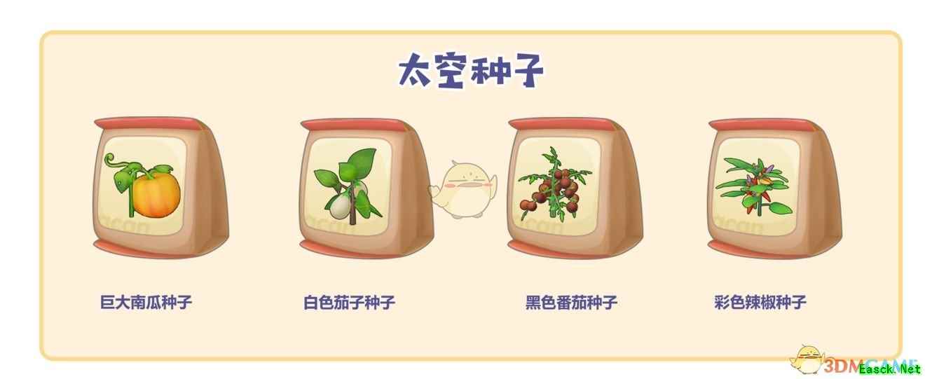 土伯伯给小摩尔带来了来自太空的变异种子,分别是太空茄子种子、太空番茄种子、太空南瓜种子和太空彩椒种子。