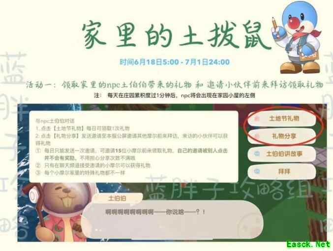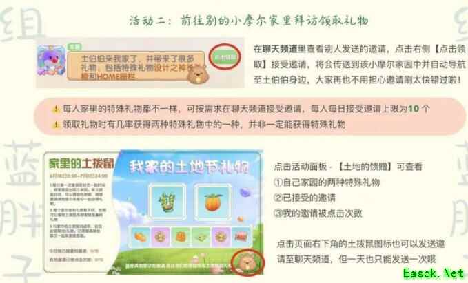 在【家里的土拨鼠】活动中,发送邀请至聊天频道邀请别的小摩尔来领取礼物,也可以接受聊天频道邀请前往别的小摩尔家园领取礼物,每天只能发送一次邀请。每天只能接受10次邀请。