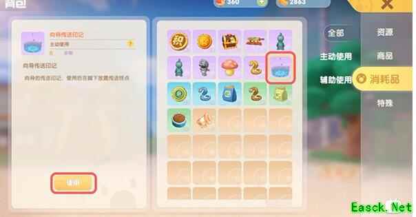 2、来到需要放置印记的位置,打开背包在消耗品中找到【传送印记】,点击左侧的【使用】;
