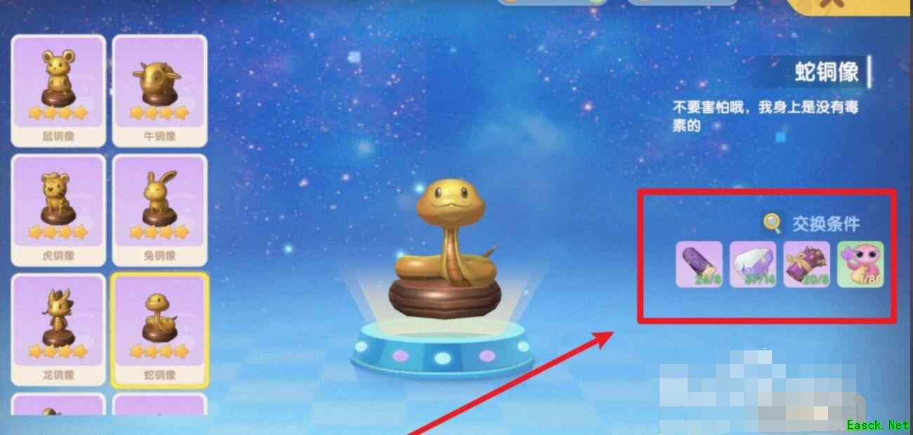 3、陈列室中“蛇铜像”的兑换材料需要樱花蛇。材料齐全就可以兑换这个家具了!