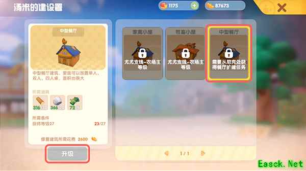 3、点击【中型餐厅】,然后点击左下角的【升级】即可。