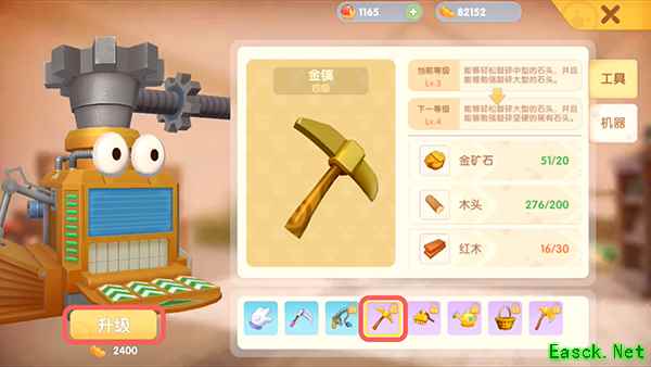 3、在“工具”下方选择需要升级的锄头,点击左侧的【升级】;