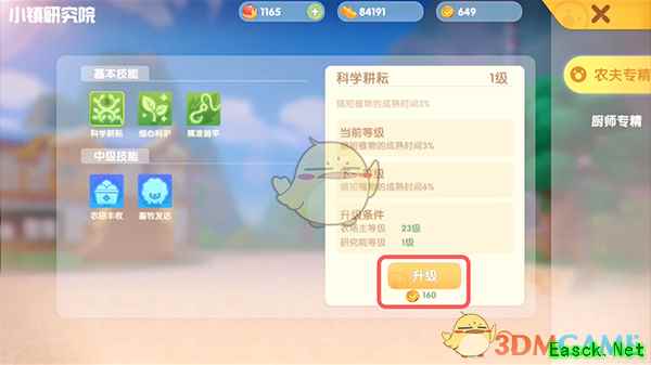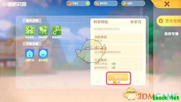 4.在【农夫专精】版块选择需要学习的技能,点击【学习】花费小镇贡献币学习,点击查看小镇贡献币获取;