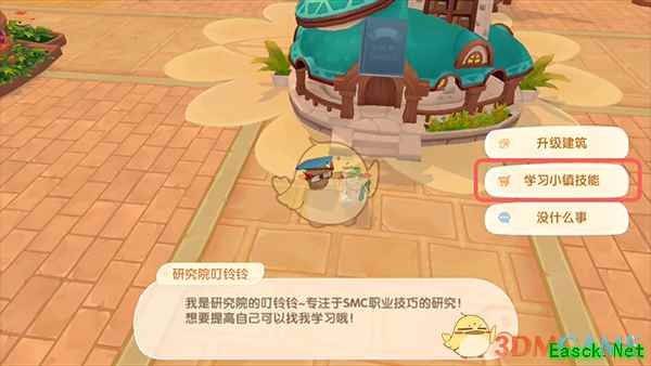 3.在小镇中找到【研究院叮铃铃】靠近后对话选择【学习小镇技能】,也可以通过右上角店铺打开;