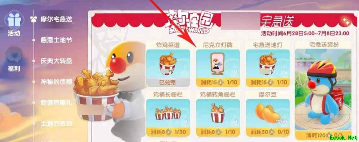 6月28日摩尔庄园与肯德基宅急送的联动活动正式启动,活动开始之后,打开摩尔庄园游戏,点击进入活动界面,选择摩尔宅急送活动,点击兑换尼克立灯牌,用15积分即可成功获取尼克立灯牌(到尼克处接取订单配送任务,获取积分)。