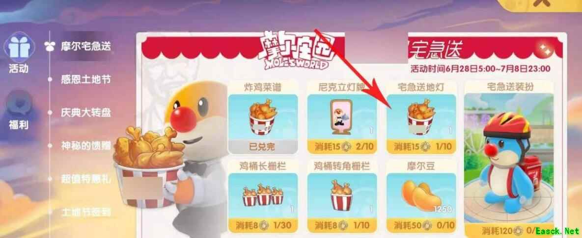 6月28日摩尔庄园与肯德基宅急送的联动活动正式启动,活动开始之后,打开摩尔庄园游戏,点击进入活动界面,选择摩尔宅急送活动,点击兑换宅急送地灯,用15积分即可成功获取宅急送地灯。