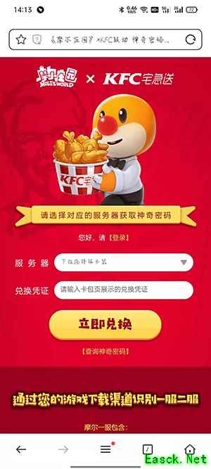 打开肯德基APP,点击【我的】;登录账户点击【卡包】;点击【券】,找到摩尔庄园兑换凭证;点击复制代码,再点击【去使用】;登录游戏账号,选择服务器,输入兑换凭证;这样兑换码就转换为神奇密码了,再点击【一键复制】;登录摩尔庄园,点击【活动】按钮;点击福利,输入神奇密码就可以拿到肯德基家具了。