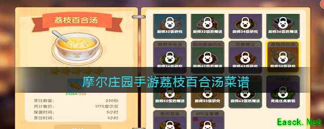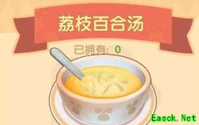 游戏中荔枝百合汤制作需要的材料包含:荔枝2个、百合花2个、小麦3个。做好了记得跟居民分享,或者卖给花婶!荔枝百合汤是是一道品质达到了5星级的料理,需要在SMC等级达到50时才能制作和解锁,其餐厅售价是234摩尔豆。