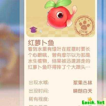 胡萝卜鱼是7月2日更新后加入游戏的季节性鱼类,在夏日季活动期间可以钓取。它会在晴朗的白天出现在浆果丛林地图的钓鱼点,稀有程度为1星,想要钓到还是比较容易的。想要获取的玩家需要注意天气以及时间。