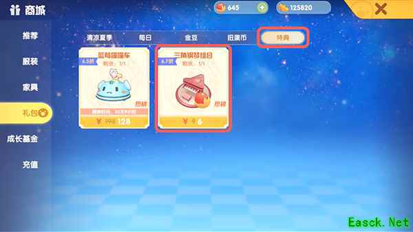 3、点击上方切换到【特典】,选择【三角钢琴组合】;