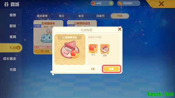 4、然后花费6元购买该礼包,即可获得一个草莓三角钢琴和60金豆。