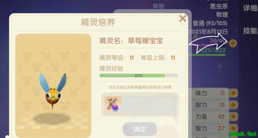 也可以使用道具增加精灵经验,点击经验条右边的+可使用道具。