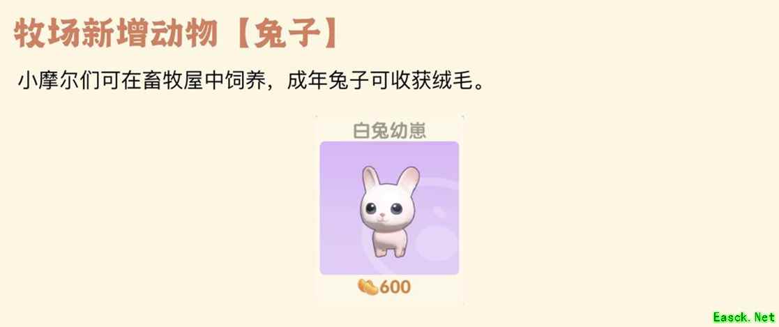 玩家可以在畜牧屋内养兔子,在兔子成年后可以收获绒毛。