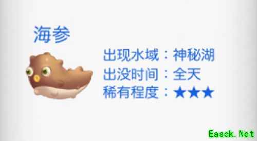 1、海参是今天更新后新增加的鱼类,只会出现在神秘湖,玩家可以去神秘湖钓。