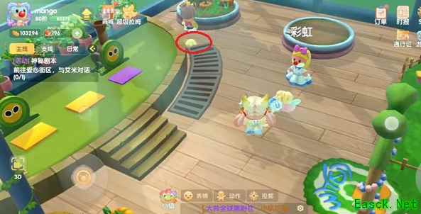 2、进入之后,就可以看到彩虹姐姐,然后在彩虹姐姐的左边靠近花坛的位置就能看到一个“黄色的脚印”,然后点击收集即可。