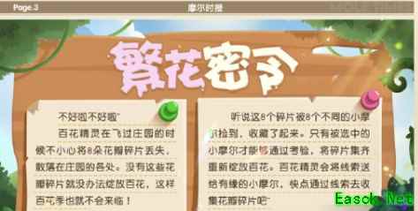 摩尔庄园8个碎片被8个不同的小摩百花精灵在飞过庄园的时候不小心将8朵花瓣碎片丢失,散客在庄园的各处。没有这些花,碎片就没办法绽放百花,这样百花季也就不会来临!
