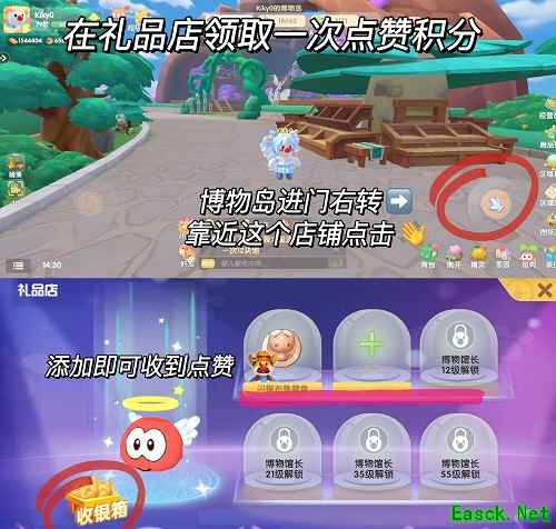 2、博物岛进门右转,靠近蓝绿色店铺点击。