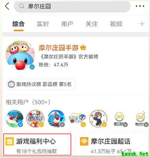 1、第一步:通过本条微博文案中的“游戏福利中心”链接,或者微博搜索“摩尔庄园”,找到“游戏福利中心”。