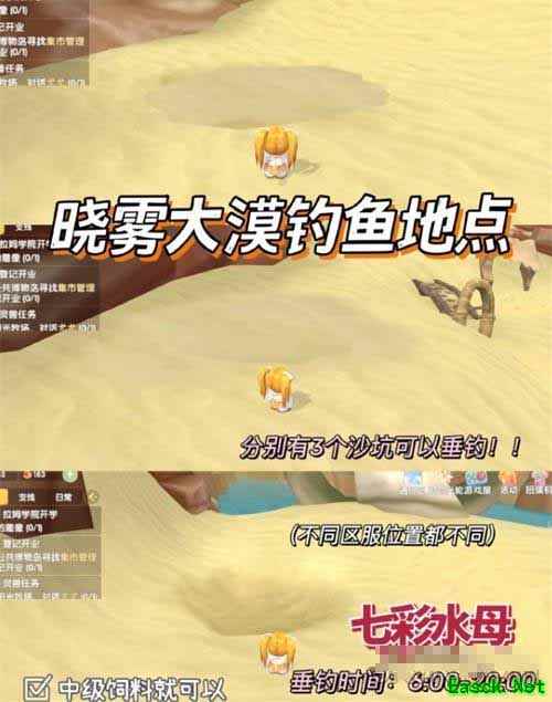 3、分别有3个沙坑可以钓取七彩水母,可以就用中级饲料。
