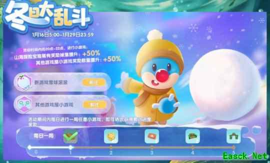 随着雪球滚滚上线,1月16日5:00-1月29日23:59会开启精彩的冬日大乱斗活动!活动期间的每天20点-22点,参与寻宝探险获得稀有道具的概率会提升,其他小游戏的奖励也会翻倍!
