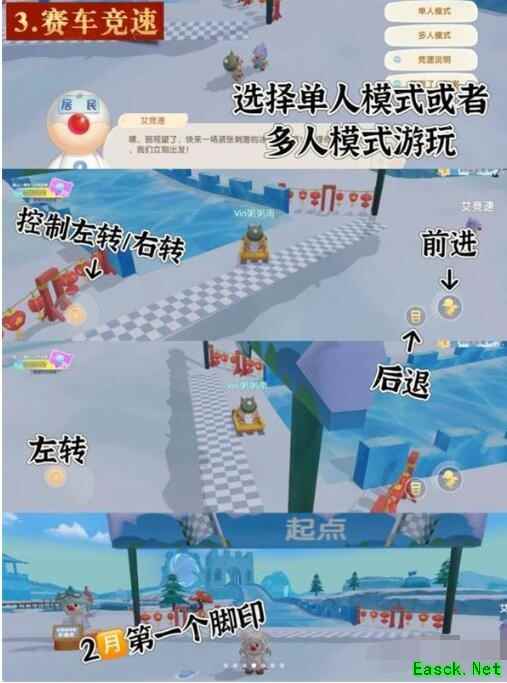 到达起点后与工作摩交互选择单人模式或者多人模式游玩,左边操作杆控制转向“左转或者右转”,右边两个按钮控制前进或者后退,赛道有几处可以抄近道,最快一下可获得20冰域币,随着时间加长,冰域币奖励会逐步减少。