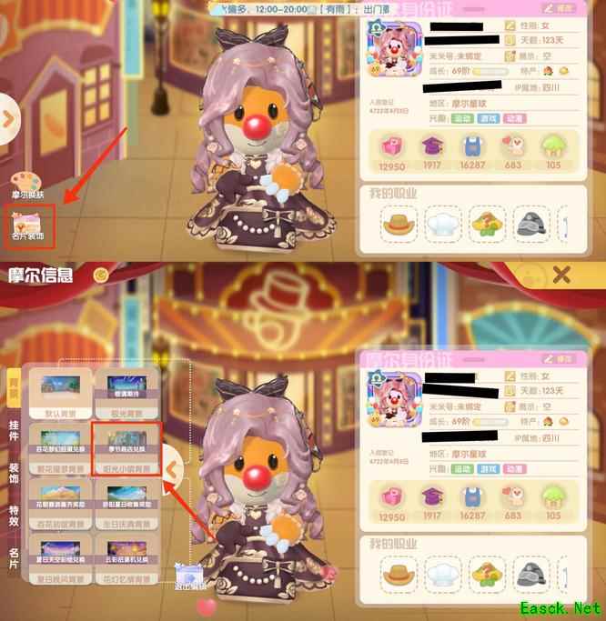 阳光小镇背景更换方法:摩尔头像—查看详情—名片装饰—阳光小镇背景