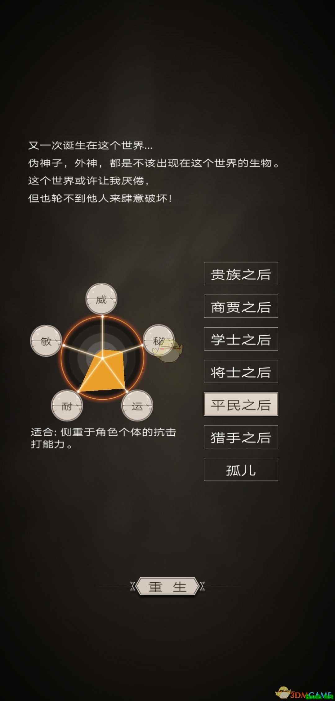 1、平民之后的特色简而言之就是肉盾流,自身的耐、运数值很高,特别耐打,而且属于玩的人比较少的一个身份。