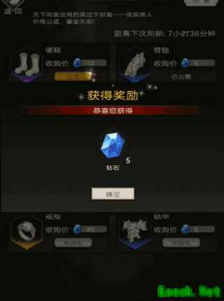 市集界面罗列着头部防具、腿部防具、衣服、护手、饰品和武器几种类型中的指定商品。每一件商品都表明着收购价,玩家若持有相应的装备,便可以在此出售自己所携带的装备,以换取相应的钻石奖励(收购价)。