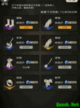 1、市集中的商品及对应品质是指定好的。例如蓝色品质的铠甲罗列在市集中,而我们仅拥有紫色品质的铠甲,市集中便会表明“未拥有”。即便你所拥有的装备品质更高,也卖不出去。当然,每隔一定时间收购商人的需求便会变动,市集内的商品会进行一次刷新。