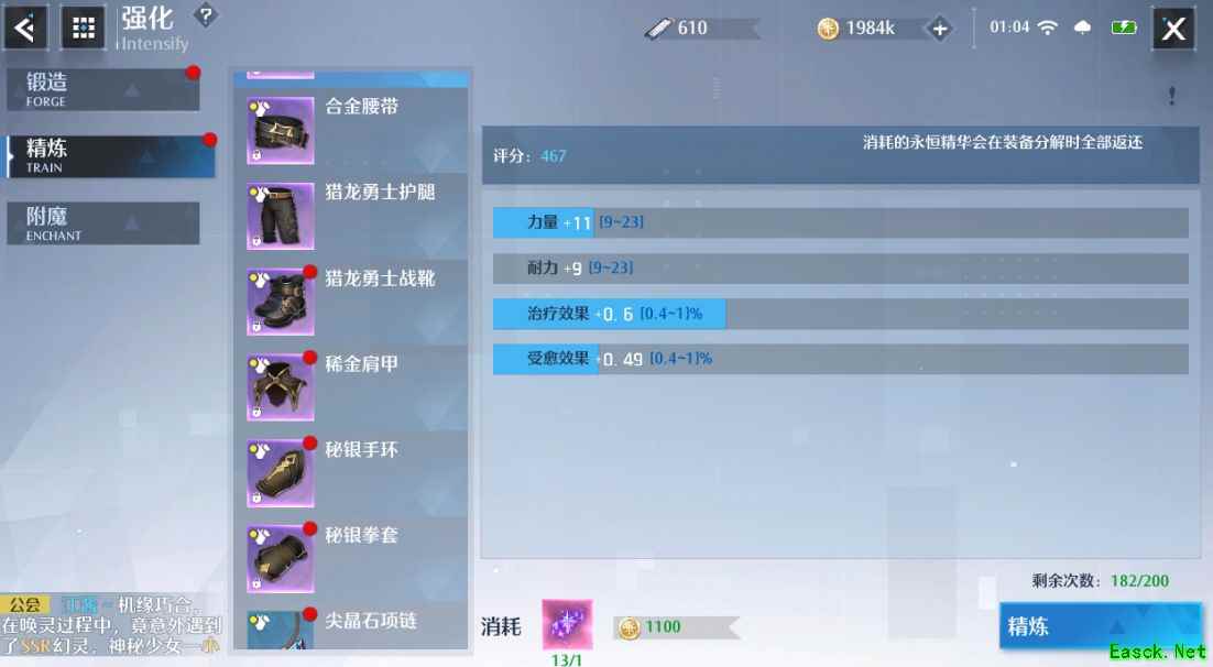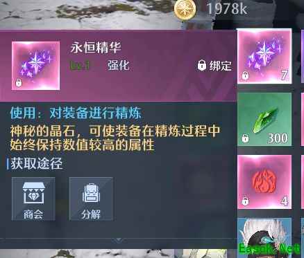 目前精炼的道具永恒精华只能在商会跟集市去购买,每天有购买限额,所以大家在洗练装备的时候不要上头,一件装备的属性洗练有增加属性就停手。