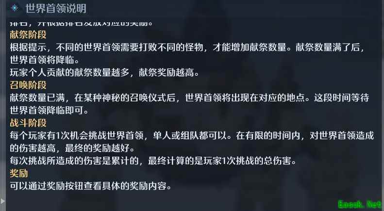 世界BOSS最终奖励机制是看个人伤害排行,每个人一次机会,在有限的时间内打出的伤害则上榜获得奖励。