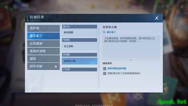 1、点开区域任务后,我们能直接看到相应地区的任务详情和接取条件,除了弗迪丝波姆冻土外的地区都只有三个区域任务,每个任务都需要角色等级和地区探索度达到一定程度。