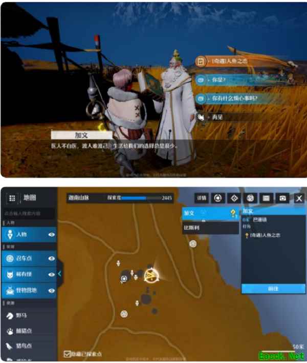 四、跟胡妮对完话前往巴珊镇找到NPC:加文,与其对话。与加文对完话继续跟加文旁边NPC:比斯利对话,并跟随比斯利前往他说的地方。