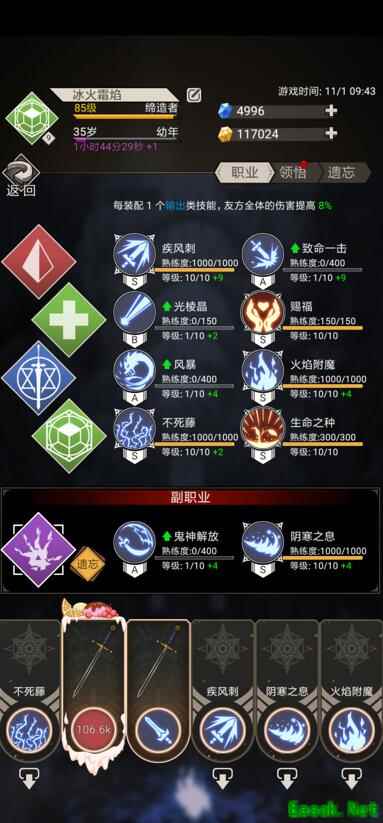 技能的选择比较灵活,如果是打单体攻击怪就可以带不死藤,如果有群攻怪就可以上抛沙;但是扛不住的话就去掉不死藤,用庇护+摆拳+抛沙的组合。