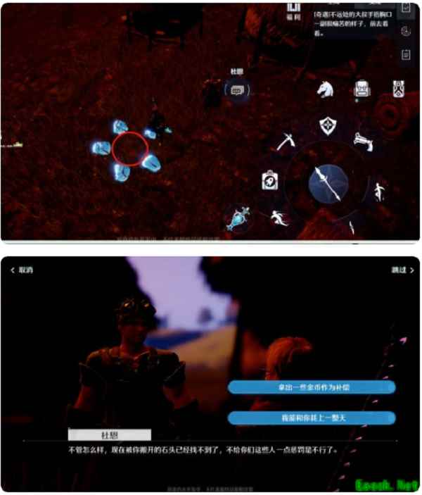 二、捡起杜恩身前石堆中央的石头,与其对话(两种选择均可,对任务流程和结局无影响)。
